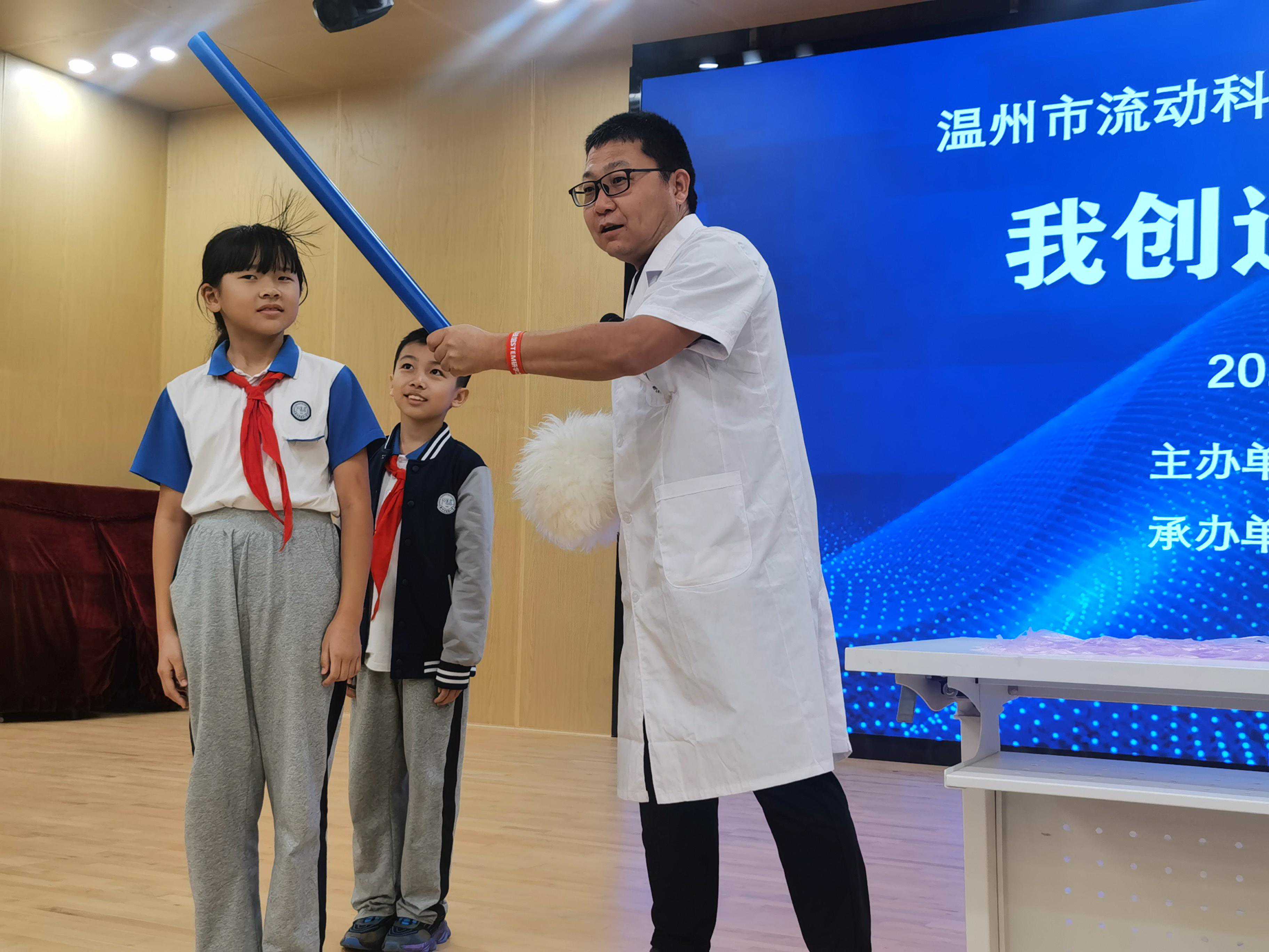10月12日下午,温州科技馆特聘专家、中国自然科学博物馆协会继续教育专家库成员田若平在温州市建设小学七都校区进行“科学实验秀之与空气对抗”课程,只见他拿出一根塑料管,用羊毛进行上下摩擦。