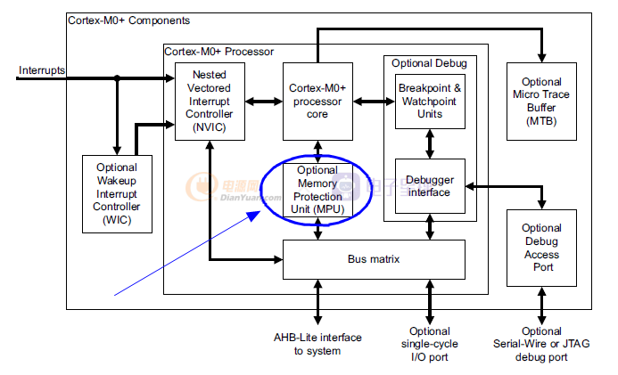 让我们结合如下Cortex-M处理器(以CM0+为例,其他版本类似)模块框图中来解释MPU作用,从框图中大家可以看到,MPU介于Core和Busmatrix中间。Busmatirx是ARM系统总线大管家,用以实现系统内多主(Core,DMA等)、多从(内部RAM,APB外设,外部总线等)的交联和仲裁,Core通过Busmatirx可以访问到系统空间内的所有存储/外设资源,现在MPU挡在了Core和Busmatirx中间,这意味着从此Core对系统存储资源的访问需要经过MPU的权限控制与审核。