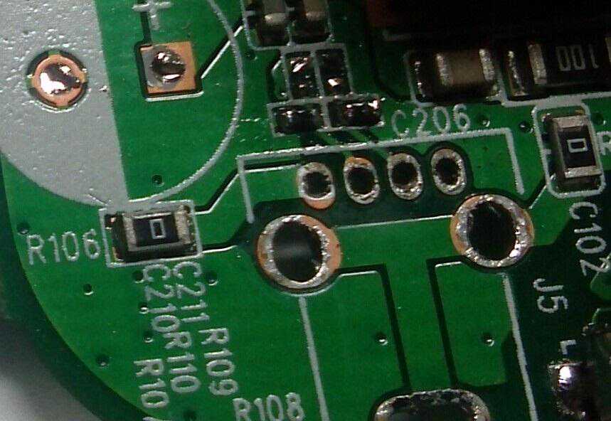 8)然后是USB位置。先拆下USB附近那些挡住烙铁的元件,并把USB数据口PCB板上的充电检测电阻(60R)拆除,但需要保留下拉电阻(50K)。用50R(大致可以22R至60R一般都可以正常使用)直插1/16W电阻(我的是用两个100R并联)接入屏蔽线的另一端芯线,用热缩管套好,屏蔽层齐根剪短即可。电阻另一端先插入USB座D-、D+孔(CPU引脚B43对应D+,A50对应D-),装上USB座即可。