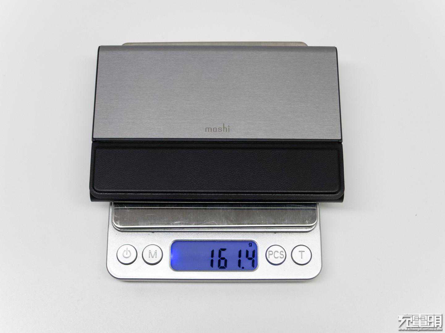 IonBank5K便携式移动电源总重161g,对比常规10000mah的移动电源重量上没有什么优势,金属和皮革的应用,自带数据线应该也是重量增加原因,应该和产品设计和用材有关。