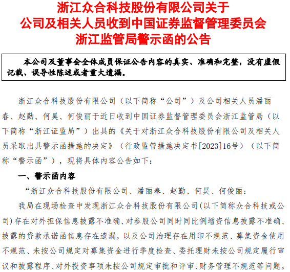 上个月刚因信披违规被责令改正风口财经注意到,就在10月底,众合科技及公司董事长兼CEO潘丽春、董秘何俊丽刚刚因为信披违规,被浙江证监局要求责令改正。