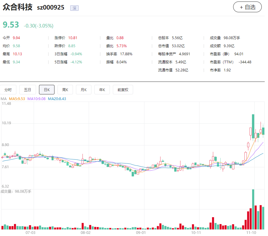 二级市场上,众合科技在今年初和11月初股价曾大涨,截至11月15日收盘,股价9.53元/股,总市值53.02亿元。