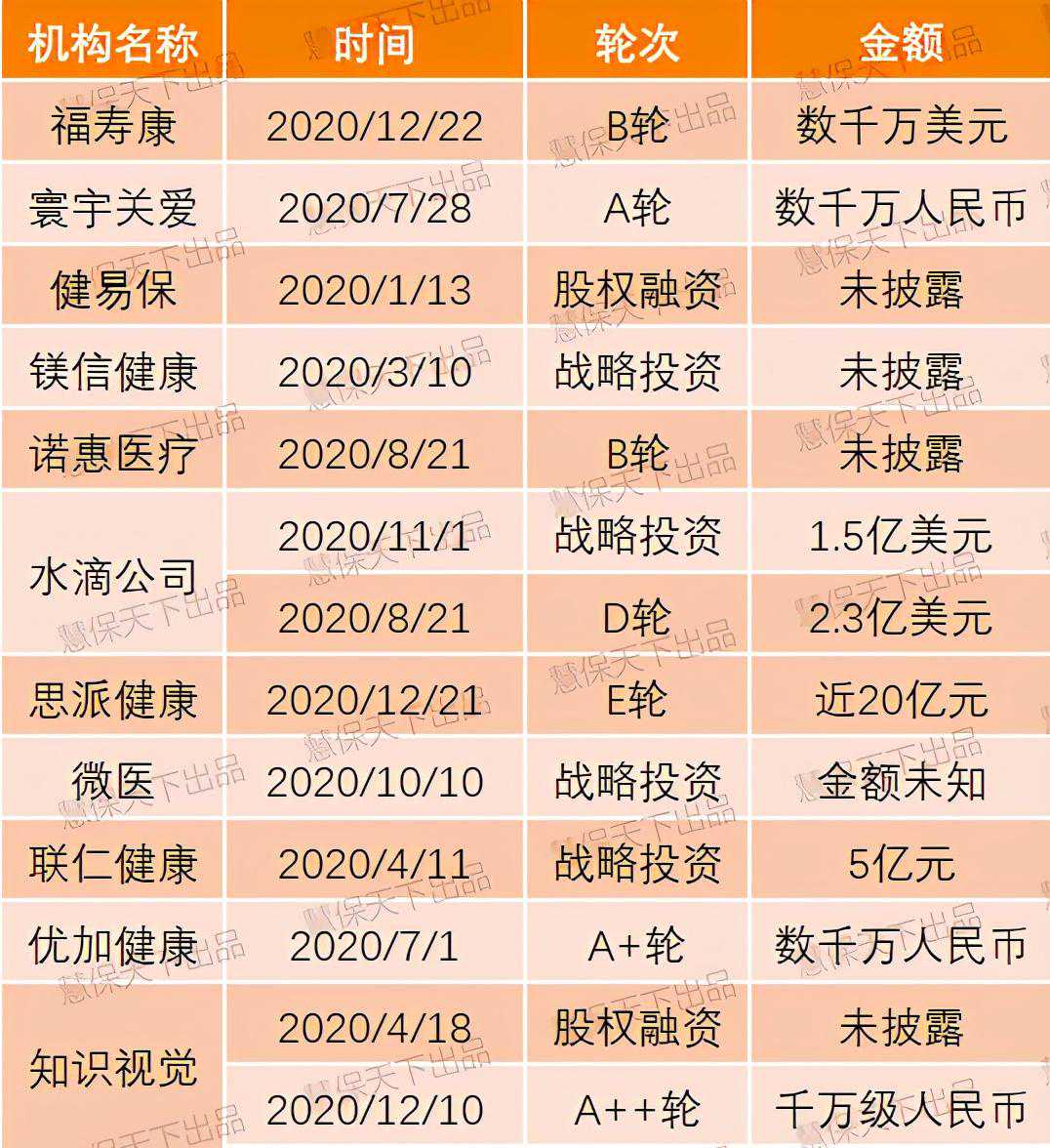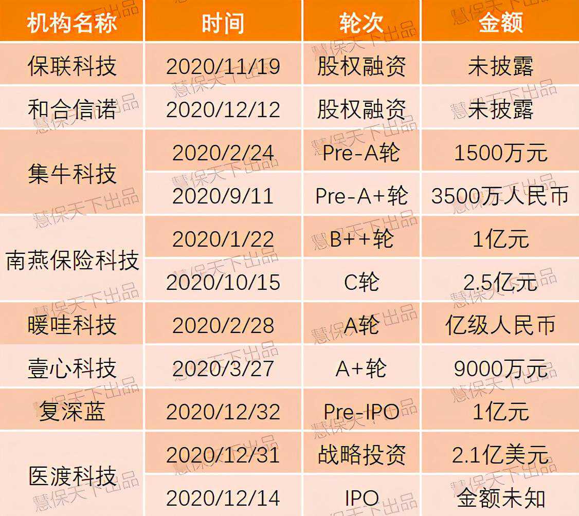 据『慧保天下』统计,2020年全年,在健康险相关科技领域共有超30家公司获40起融资,其中,8家公司累计融资额过亿元,3家公司更是已经成功实现IPO。