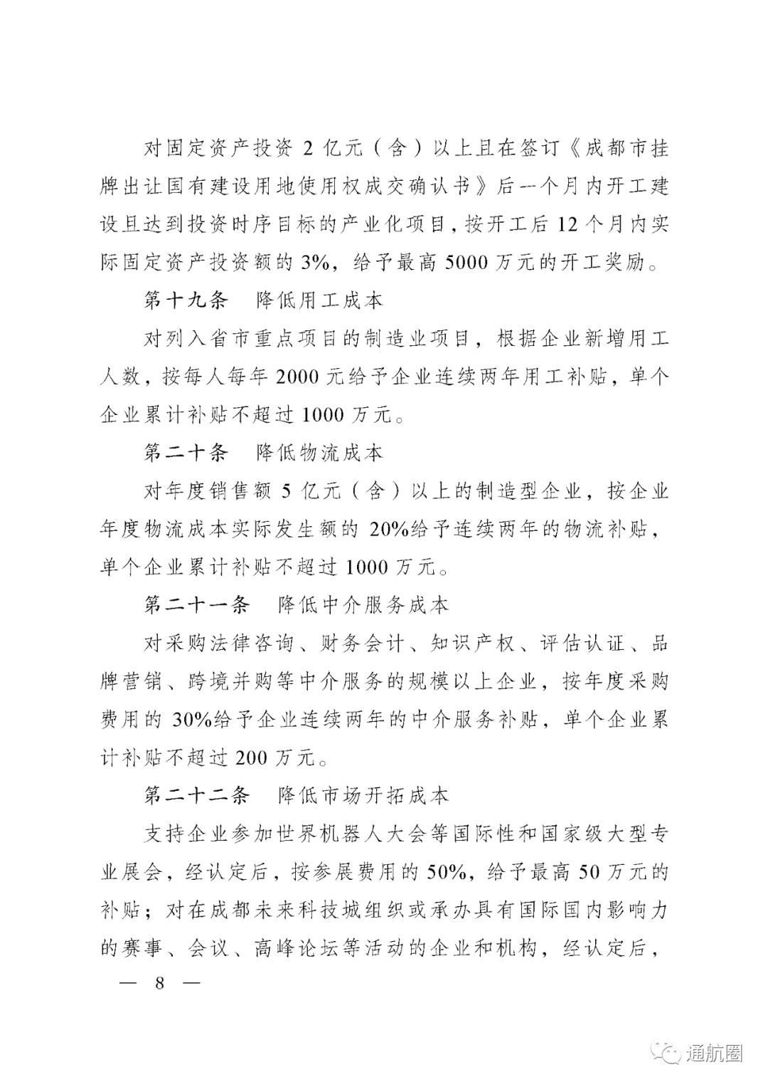 此外,文件还包括了降低企业建设成本、用工成本、物流成本、中介服务成本、市场开拓成本的措施:对固定资产投资2亿元(含)以上且在签订《成都市挂牌出让国有建设用地使用权成交确认书》后一个月内开工建设且达到投资时序目标的产业化项目,按开工后12个月内实际固定资产投资额的3%,给予最高5000万元的开工奖励。对列入省市重点项目的制造业项目,根据企业新增用工人数,按每人每年2000元给予企业连续两年用工补贴,单个企业累计补贴不超过1000万元。对年度销售额5亿元(含)以上的制造型企业。按企业年度物流成本实际发生额的20%给予连续两年的物流补贴,单个企业累计补贴不超过1000万元。对采购法律咨询、财务会计、知识产权、评估认证、品牌营销、跨境并购等中介服务的规模以上企业,按年度采购费用的30%给予企业连续两年的中介服务补贴,单个企业累计补贴不超过200万元。支持企业参加世界机器人大会等国际性和国家级大型专业展会,经认定后,按参展费用的50%,给予最高50万元的补贴;对在成都未来科技城组织或承办具有国际国内影响力的赛事、会议、高峰论坛等活动的企业和机构,经认定后,按活动飞友的50%,给予最高100万元的补贴。