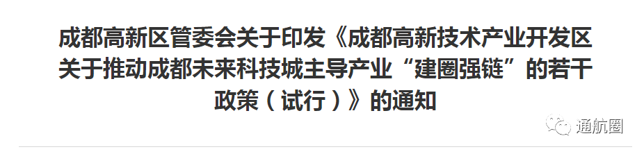 4月19日,成都未来科技城举办航空航天产业链发布暨卫星互联网产业企业沙龙活动。据通航圈获悉,为深入贯彻落实成都市推进产业建圈强链相关要求,推动成都未来科技城主导产业“建圈强链”,促进产业加快集聚,成都高新区管委会已正式印发《成都高新技术产业开发区关于推动成都未来科技城主导产业“建圈强链”的若干政策(试行)》,其中明确提出将航空航天产业列为成都未来科技城的主导产业之一,鼓励航空航天产业集群发展,明确从生产线落地、平台建设、人才引进、技术创新、成果转化、协作配套等方面提供全方位支持。此外,文件明确成都高新区财政还将出资4亿元设立首期20亿元的产业发展专项基金。该政策自2023年1月29日起施行,有效期2年。据成都高新介绍,2020年筹建的成都未来科技城目前已落地天府绛溪实验室、民航科技创新示范区、中国民航飞行学院天府校区等一批重大战略性项目,凌空天行、杰诺创等一批行业骨干企业加快聚集,初步构建起“产学研用”一体的航空航天创新、产业生态。