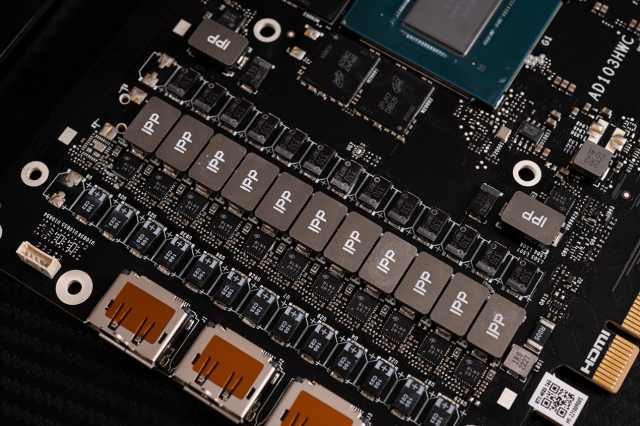 PCB正中央的AD103-300-A1核心便是此次的主角,采用TSMC4N工艺制造,拥有9728个CUDA核心,在游戏性能上可以达到RTX3080Ti的两倍,甚至部分场景下还能超越上代卡皇RTX3090Ti。