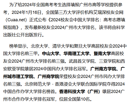 校友会2024广州市大学排名,中大、香港科技大学(广州)问鼎榜首