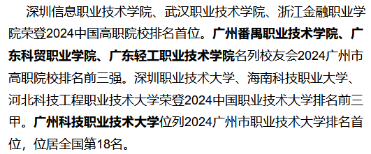 广州番禺职业技术学院、广东科贸职业学院、广东轻工职业技术学院名列校友会2024广州市高职院校排名前三强。