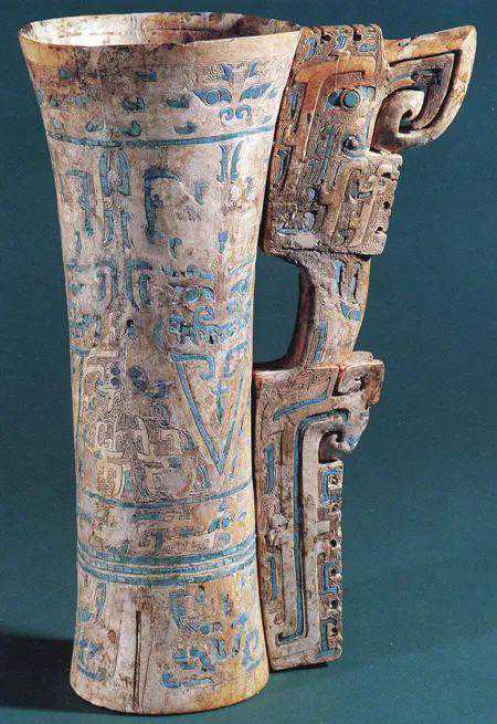 此外,象牙杯也体现出商代对夏代镶嵌艺术的传承,除了选用绿松石在一个画面上下多层镶嵌之外,一些绿松石也表示圆雕骨鹿、虎、龟、蛙等动物的眼、耳、鼻,有的则在动物身上也嵌绿松石点缀。