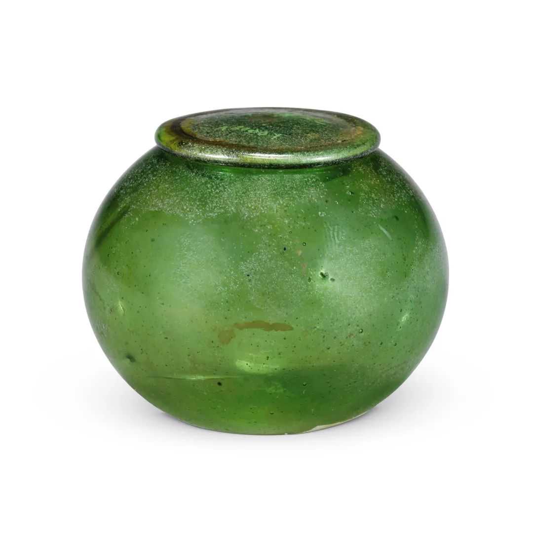 器物呈扁圆形,鼓腹,瓶口缩颈,配扁圆形盖,盖内为子母口,圜形底。器壁极薄,通体呈透明绿色,晶莹玉润,造型优美。出土时还发现5个呈宝珠形的绿色玻璃小珠,珠上有折断痕迹,推测应是绿玻璃盖罐盖子上折断掉落的钮饰。