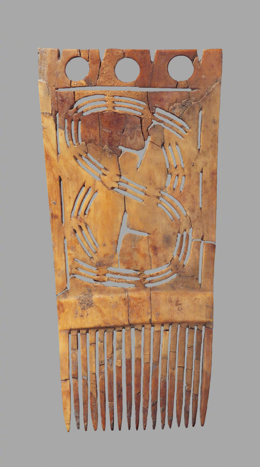 用象牙制成,背厚齿薄,梳身采用镂雕技术。上端钻3个圆孔,边缘刻有沟槽,似为镶嵌之用。主体部分镂雕出由3行条孔组成的“8”字形旋纹图案,并内填“T”形花纹。下端共有17个细密的梳齿。