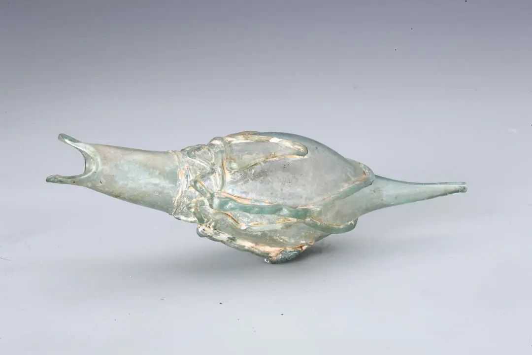 与罗马和萨珊风格相近,应该是采用罗马吹制技术——无模自由吹制技术成型的。如果要吹成这个样子,需要先用铁管从玻璃炉中挑出玻璃料,然后将铁管向下,先用微气缓慢俯吹成型,再用剪刀引长,并截其口而引拗成喙形,再用剪拉长另一端作尾,这几个工序都要在炉前玻璃不流不凝的条件下迅速而果断地完成。