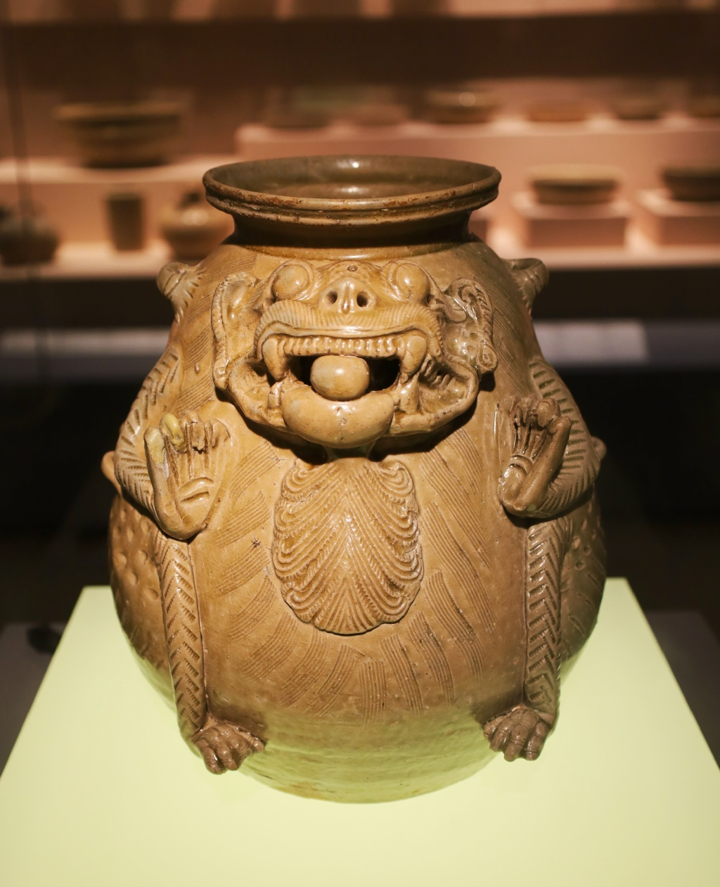 匠师紧紧抓住器形削肩鼓腹的形体特征,运用夸张写意手法,以盘口作兽的头顶,以器腹为兽腹,以器耳为兽耳,兽爪兽脊等都有序地布列在器物的各个部位,让人“尊”、“兽”难辨。
