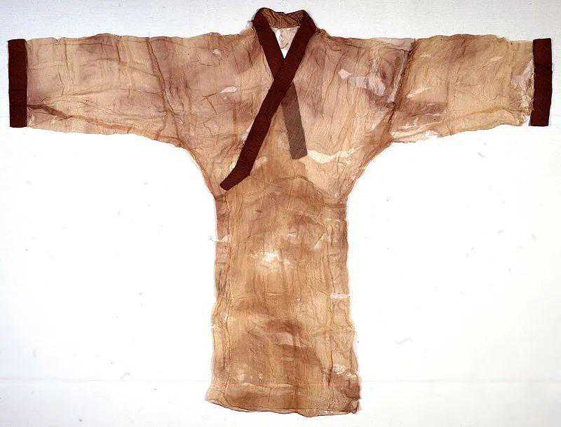 直裾素纱襌衣为交领,右衽,直裾。面料为素纱,边缘为几何纹绒圈锦,没有颜色,没有衬里,它由精缫的蚕丝织造,其蚕所吐蚕丝颇为轻细,这也是衣服极轻的根本原因。
