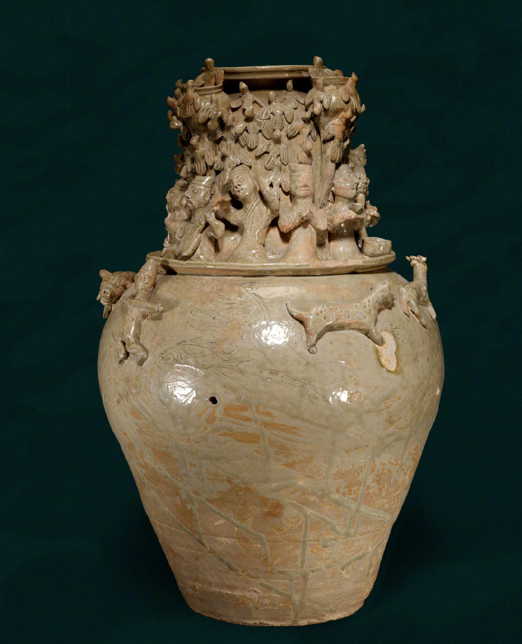 该文物属于青瓷,代表了汉晋青瓷的工艺水平。青瓷最早出现在江南,采用当地富产的优质高岭土,用不同于北方馒头窑的龙窑制成,从而将铁含量降到1%,还产生1300度的高温,使得瓷胎硬度得到提升,堆塑谷仓罐的复杂造型由此得以实现。