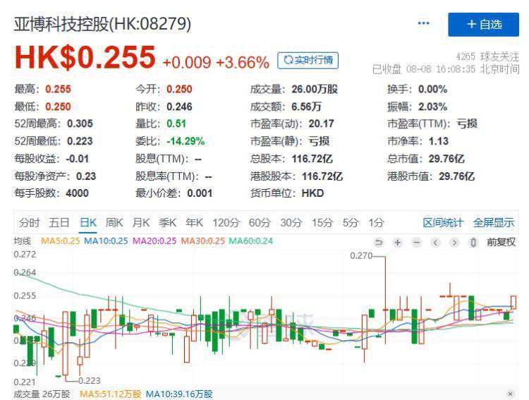 截至8日收盘,亚博科技控股报0.255港元/股,上涨3.66%,总市值29.76亿港元。