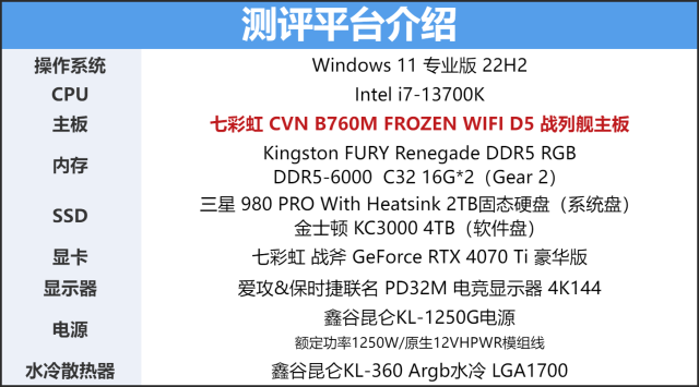 为了更好地展现七彩虹CVNB760M战列舰主板的性能,在测试硬件配套上,CPU处理器我们选择Corei7-13700K、GPU显卡选用同款七彩虹的战斧RTX4070Ti显卡加KingstonFuryBeastDDR5-6000内存套装组成整个主板测试平台的核心硬件。