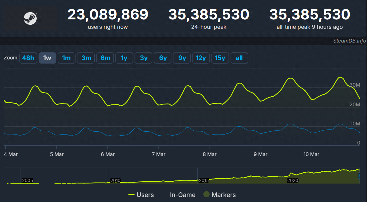IT之家3月11日消息,上个周末,Steam同时在线峰值达到34298950人,代表Steam在线人数首次突破3400万。仅过去一周的时间,这个纪录已经被刷新至35385530人。