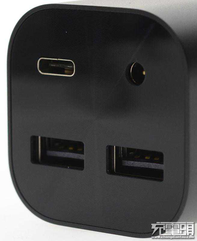 将贴纸撕开,就可以看到两个USB-A插座(输出1/2)、一个Type-CUSB-PD插座(输出3)、一个圆孔DC插座(充电输入)。