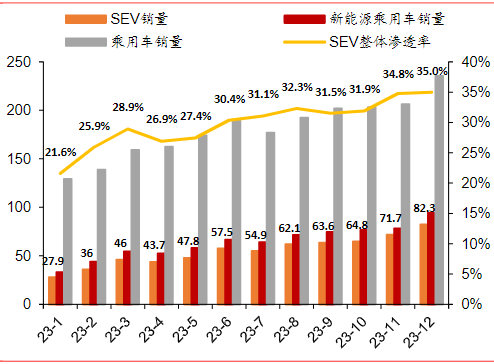 智能化是汽车变革的下半场,2023年本土智能电动车渗透率快速攀升,根据亿欧网援引乘联会数据显示,到12月我国智能电动车(SEV)渗透率已达到35.0%。据工信部统计,我国一季度新能源汽车产销分别完成211.5万辆和209万辆,同比分别增长28.2%和31.8%%。