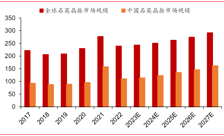 据亿渡数据预测,2023-2027年,全球石英晶振市场规模的年均复合增速有望达到4.66%,而中国市场则有望保持6.23%的年均复合增速,并从2023年的113.45亿元增长至2027年的161.57亿元。