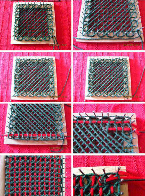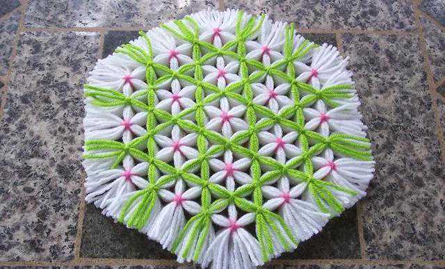 如果觉得钉木条有点麻烦,没有太多的工具可操作,可找一块泡沫板,在上面插满牙签图钉细钉子一类,喜欢什么图案就用钉子围成什么图案,之后用毛线编织就可以了。