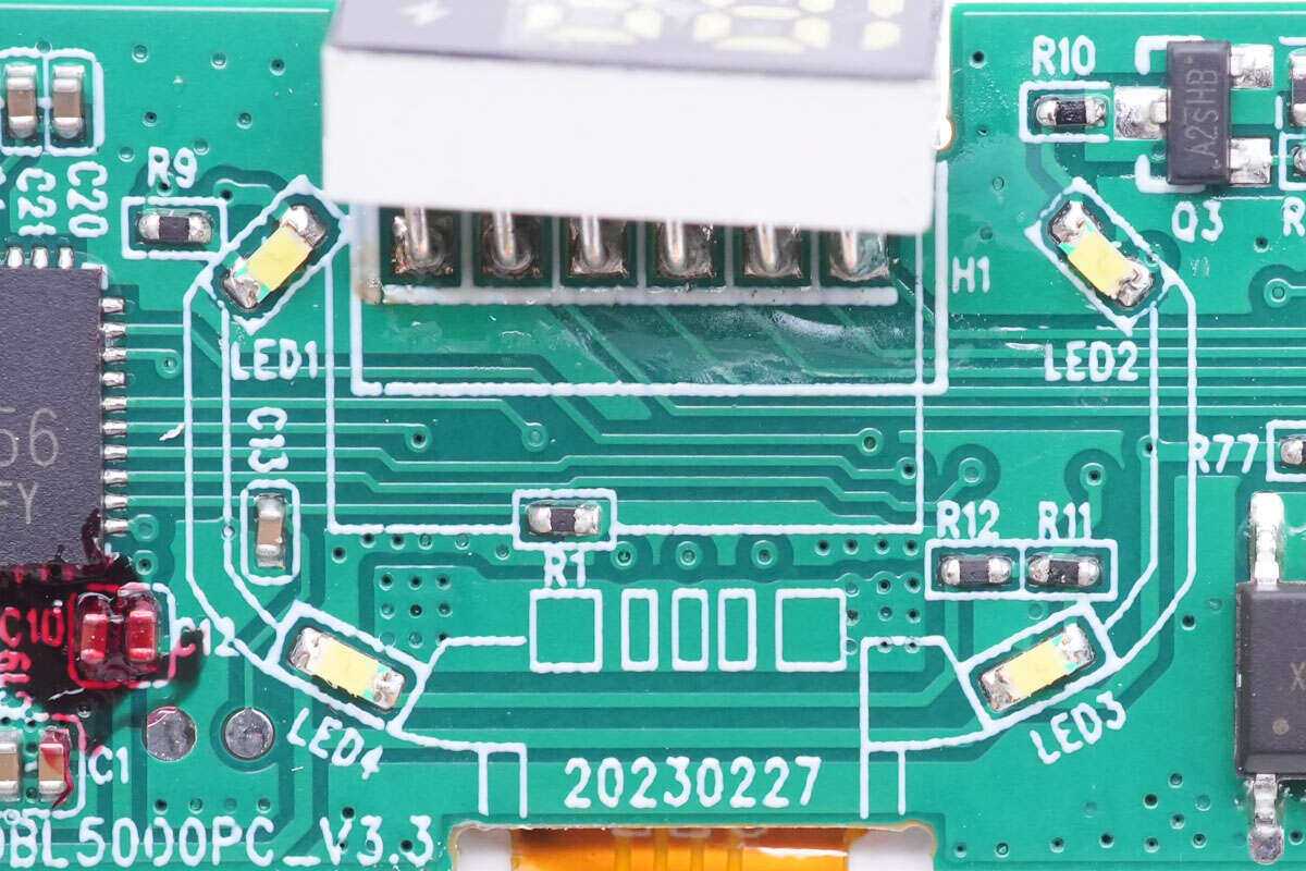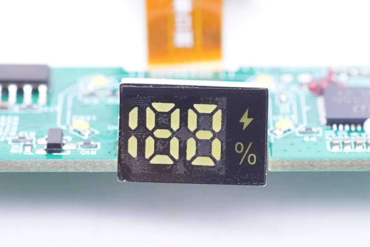 PCBA模块正面一览,左侧为电量检测按钮,依次焊接合金电感,移动电源主控芯片,电池保护芯片和无标MCU,在上方焊接LED数码管,中间焊接LED指示灯,右侧焊接USB-C接口。