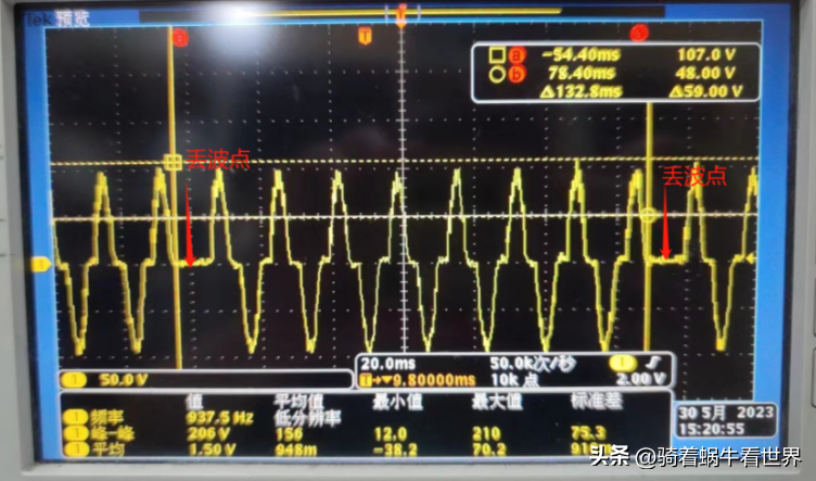 将示波器时间轴调长后可以更直观看到周期性丢波的效果。