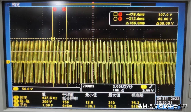 这个是示波器测试heater测试点得到的对应丢波波形,可以看到周期性的波形中出现了两次半波丢失,这就是丢波的效果。而根据示波器的测试点我们可以得到,其实缺失的半波实际才是heater工作的点。通过光标获得的数据可知两个丢波点之间的时间为132.8ms,对应的半波数为132.8/8.33ms=16个,每16个半波就丢掉1个半波,则负载的功率也会被控制到全功率的1/16。