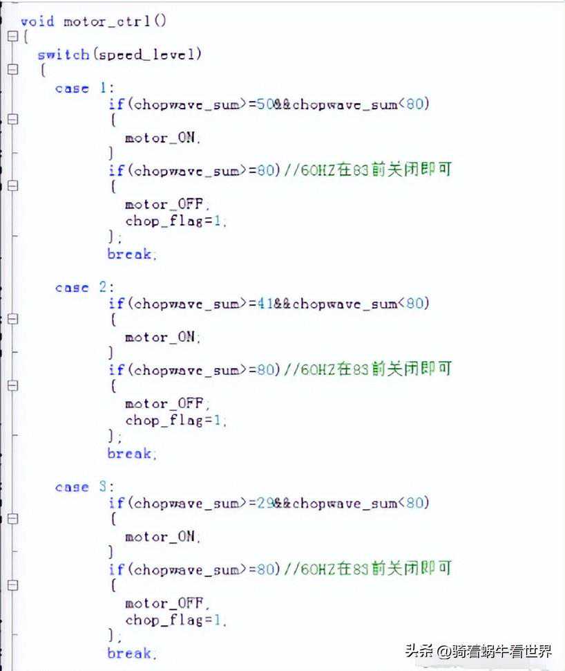 这是对应的电机斩波控制程序,这里我用到的是100us计数一次的定时器,可以看到我在计数到80的时候就会把可控硅驱动信号关掉,对应的就是在检测到过零信号后8ms,就会把信号关掉。这样做的原因是因为双向可控硅一旦开启,就需要在满足两个条件下才能关闭:1.AC过零;2.没有驱动信号。所以当我在斩波点开启驱动信号之后,我只要在过零点前随时关闭驱动信号即可,负载还是会将后续到过零点之间的功率都做完。而我提前关闭的好处是可以避免影响到下一个斩波波形,如果我在83关闭,即过零之后的8.3ms,对应着下一个过零点,若是定时器不够准确或者有信号延迟等因素影响,则可能会导致已经过零点之后我才关掉驱动信号,结果就是导致下一个半波完全打开工作。提前关闭的另一个好处则是省电,在一些MCU电源供电能力不足的地方,通常只会开启驱动信号很短的时间,防止MCU电源电压被拉低。
