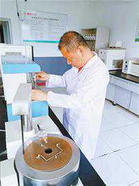 走进新疆福克油品股份有限公司润滑材料技术研发中心,总工程师严晓虎正在进行新型润滑产品配方的研发实验。(王丽丽摄)