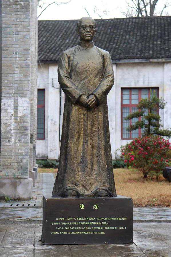 在厂区中心,有一个伫立着一排铜人像的小广场。姜总介绍道,这些铜人像,就是当时任职厂长和技术专家的茶界大师们。第一位大师是陆溁。早在清政府时期(1905年),南洋大臣、两江总督周馥就派遣一批官员到印度、锡兰(现今斯里兰卡)考察茶叶及烟土税则,其中随行的就有陆溁。考察回国后,陆溁的《乙巳调查印锡茶务日记》就写道:“中国红茶如不改良,将来决无出口之日。”因为当时的印度、锡兰已经开启了机械化制茶、大批量生产,味厚价廉,而中国的茶叶制作还停留在手工制茶阶段,茶叶品质好但是价格高,但此时的清政府已经无力改革。直到1915年,北洋政府出资并委任陆溁为场长,建立中国的第一家茶叶改良生产科研机构,也就是现在我们看到的“安徽模范种茶场”,1917年改名为“农业部茶业改良场”,由此开了中国茶从未有过的创举,陆溁也被誉为中国现代茶业奠基人。