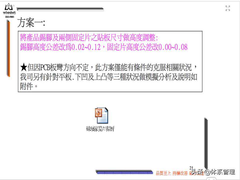 简介【体系管理】空焊不良要因分析报告----未完部分可【阅读原文】!私信可获得自助下载地址!【体系管理】专注于质量、环境、职业健康安全等管理体系知识的分享!分享内容:企业内外部培训教材PPT、管理体系制度文件、表单模板案例、内部审核技巧、外部审核准备迎审技巧、管理体系建设实战案例、注册审核员考试资料、内...