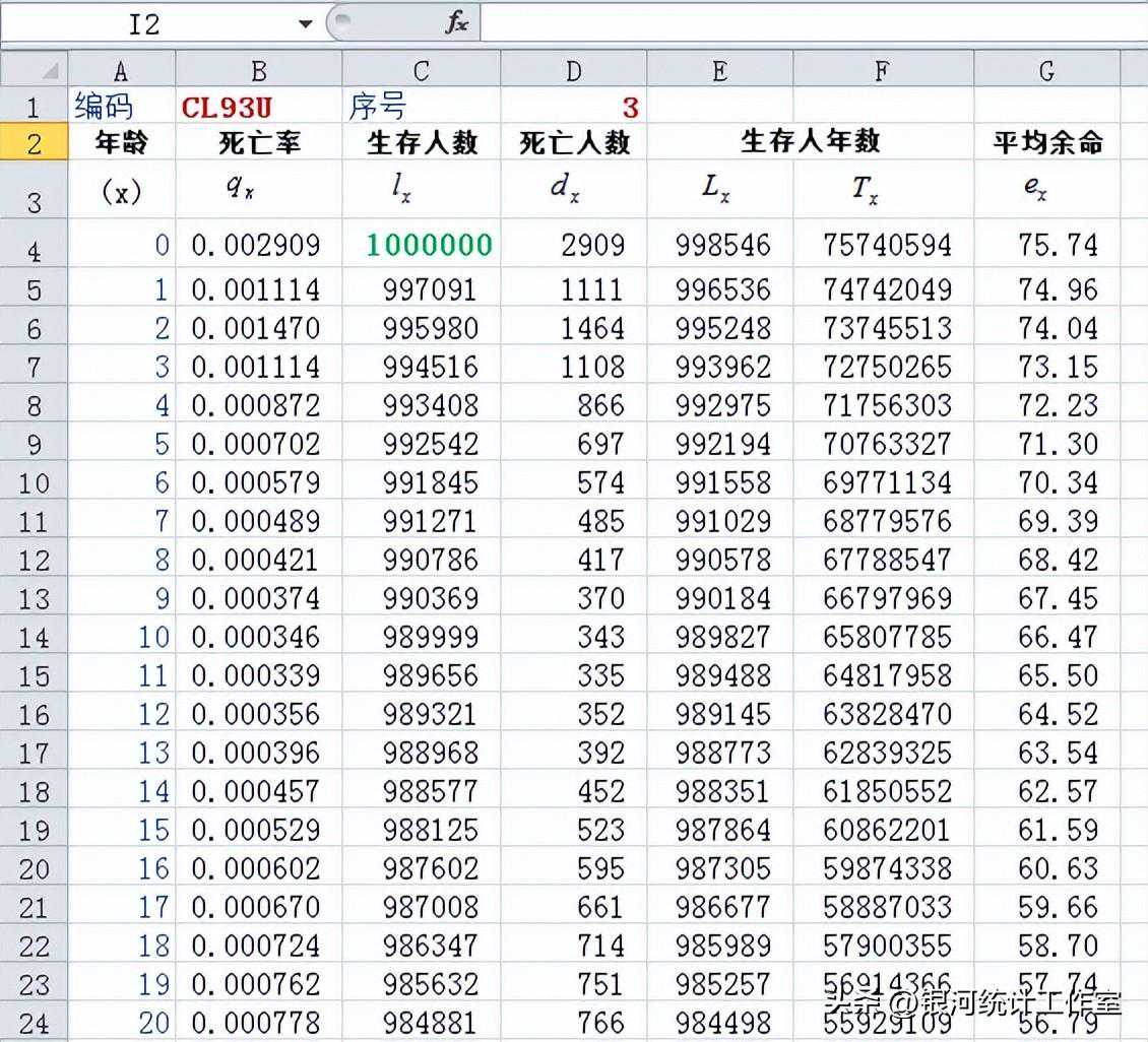 检验生命表只给了不同年龄死亡率数据,实际运用中,需要构造人数基数为100万人、包括死亡率、生存人数、死亡人数、生存人年数、平均余命等指标的各个生命表(共16张生命表:93年6张、03年4张、13年6张)的统计构造表。