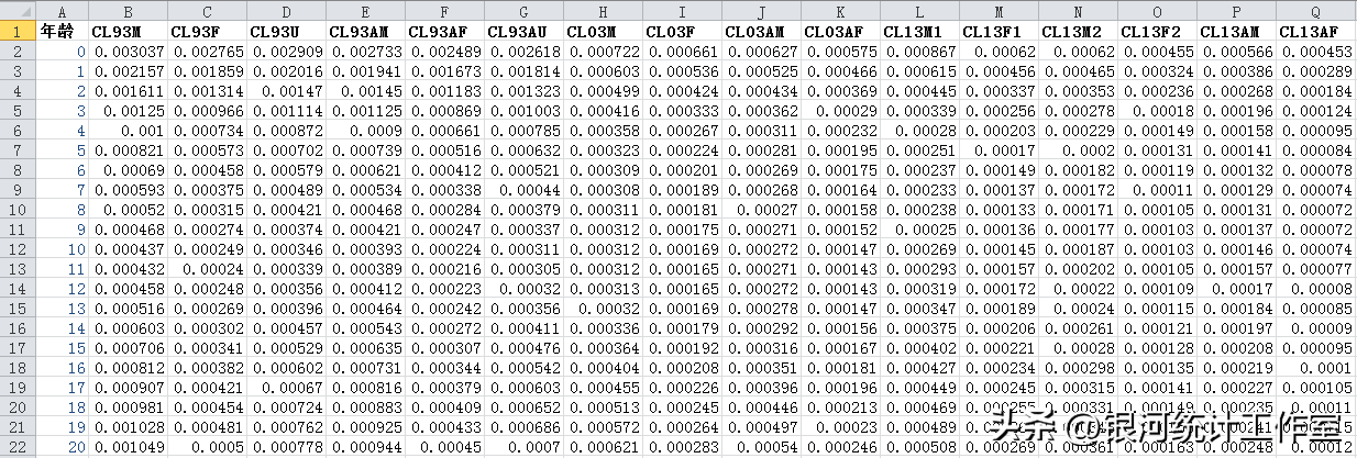 上图为16张生命表死亡率汇总表部分样例(0-20岁),数据存储在sheet2表格中。sheet2第一行为经验生命表编码。