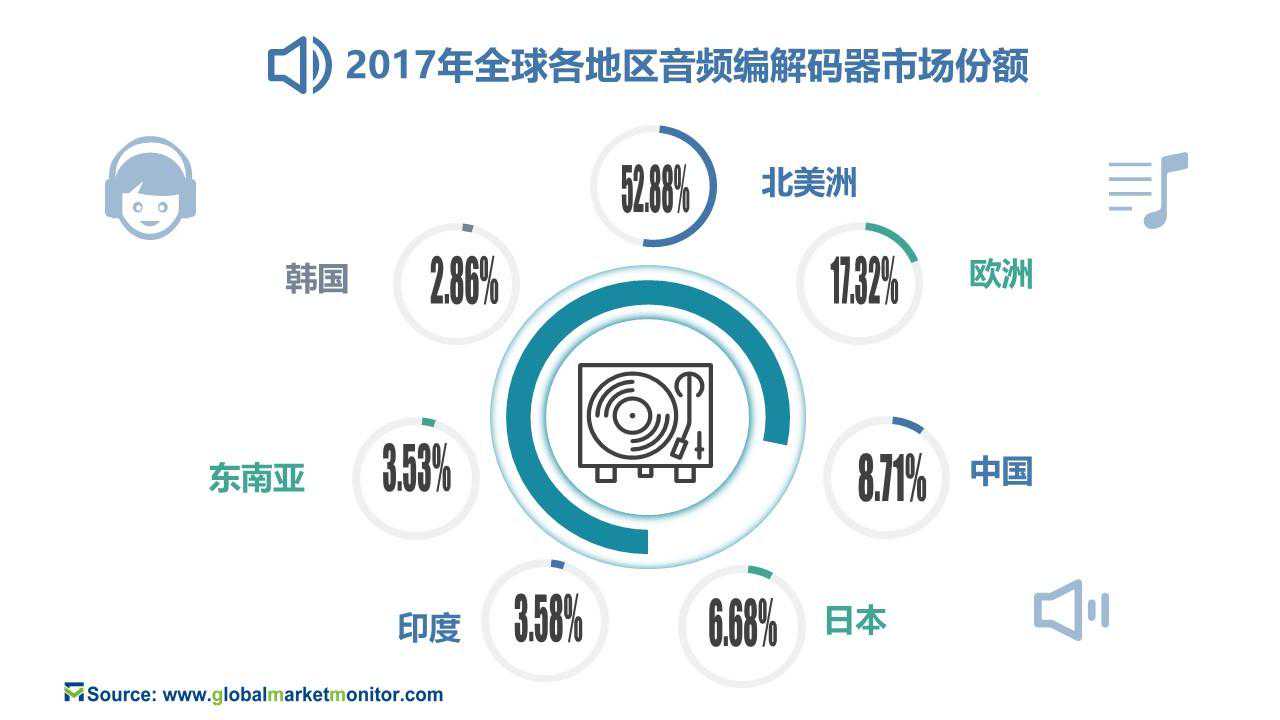 北美地区拥有发展完好的市场,众多高端品牌和音频编解码器相关厂商,如高通、德州仪器、美信。欧洲人民生活水平高,对音频编解码器的要求高,因此欧洲地区的音频编解码器行业发展兴旺。亚太地区情况较为复杂。亚洲的发达国家中,韩国拥有三星和LG巨无霸公司,在音频编解码的下游市场链占了较大的份额。韩国经济是典型的出口驱动模式,半导体产业对出口的贡献处于领先地位。作为世界八大工业国中唯一坐落在亚洲的日本,日本的工业一直处于世界领先地位,音频编解码器市场份额在亚洲仅次于中国。作为亚洲第一大、世界第二大经济体,中国拥有丰富的劳动力市场和广阔的市场前景,不少跨国公司都选择把工厂设在中国。同为新兴国家的印度现在是全球增长第二快的服务经济体国家,这里也是音频编解码器的潜在市场。