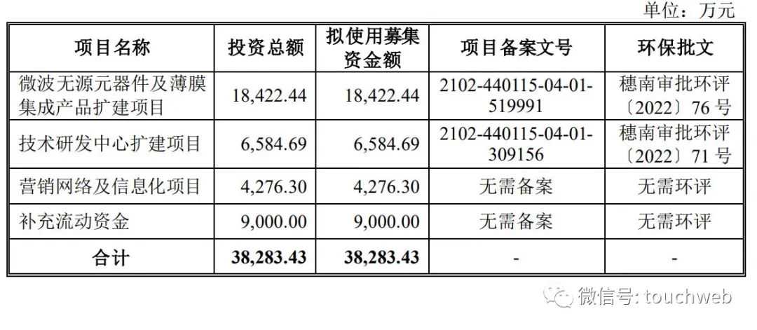 其中,1.84亿元用于微波无源元器件及薄膜集成产品扩建项目,6585万元用于技术研发中心扩建项目,4276.3万元用于营销网络及信息化项目,9000万元用于补充流动资金。