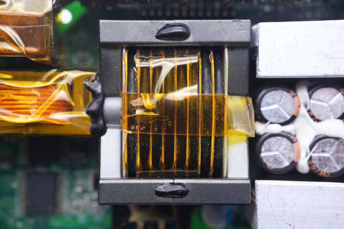 励磁电感特写,采用利兹线绕制,磁芯缠绕高温胶带绝缘。