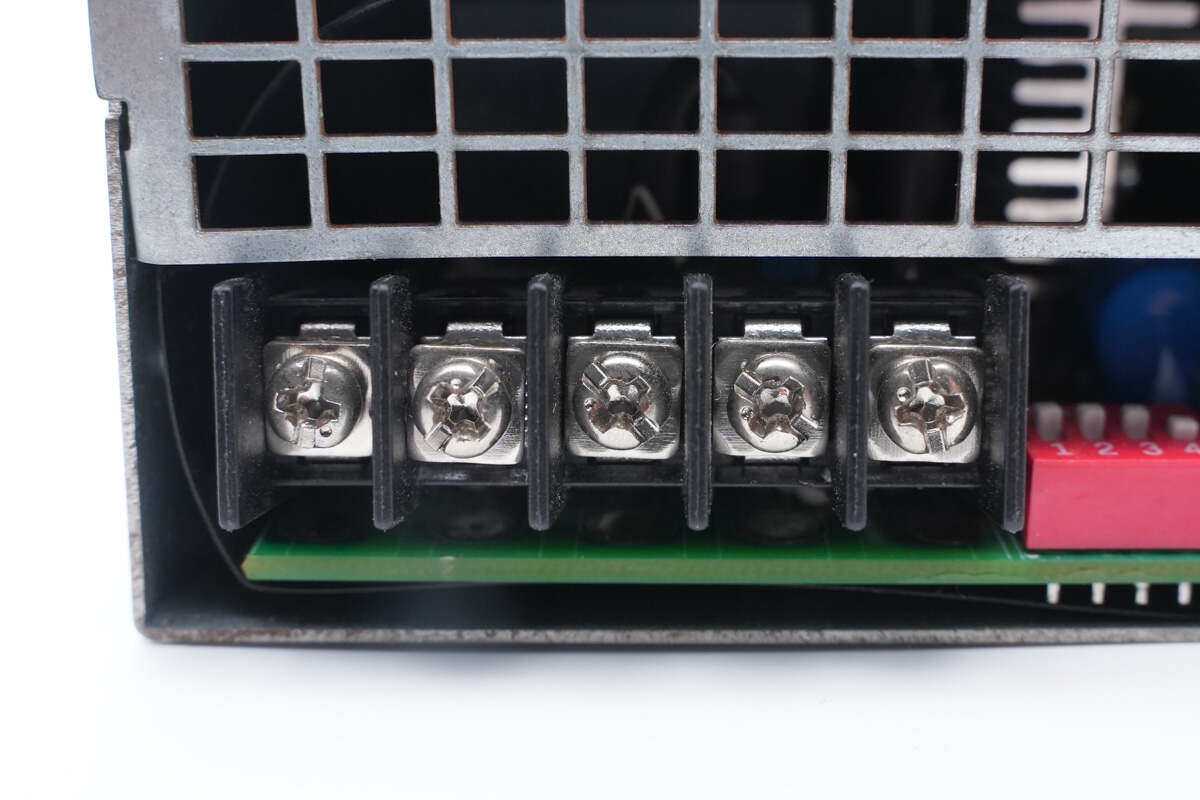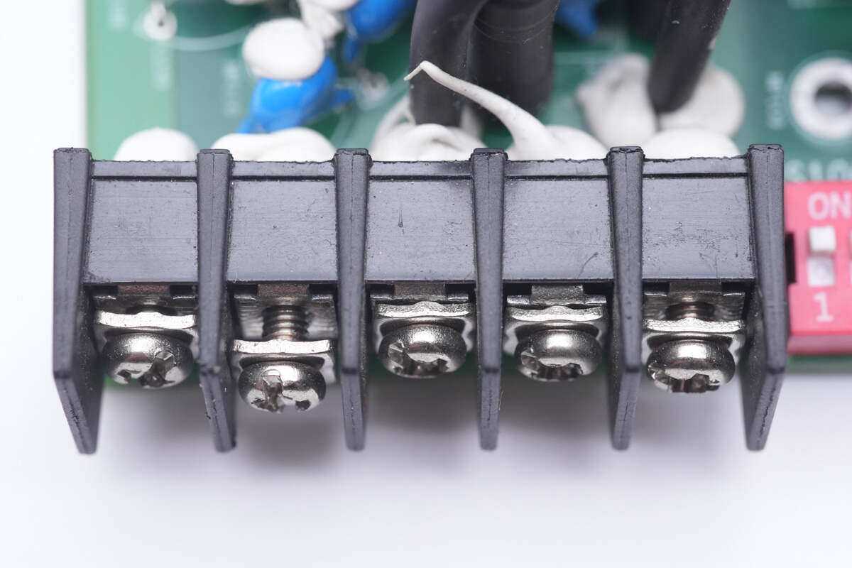 双向逆变器接线端子特写,依次为交流输出和交流输入接线柱,地址拨码开关,直流输入输出接线柱和RS485/CAN总线通信接口。透过散热格栅可以看到内部的散热片。