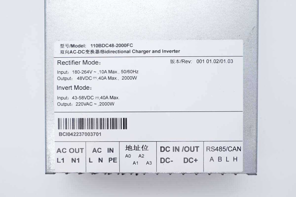 这款双向逆变器型号为110BDC48-2000FC,整流模式下支持90-264V输入电压,逆变模式下支持43-58V输入,110/120/220/230V输出,满足48V电池组储能等相关新能源应用场景。