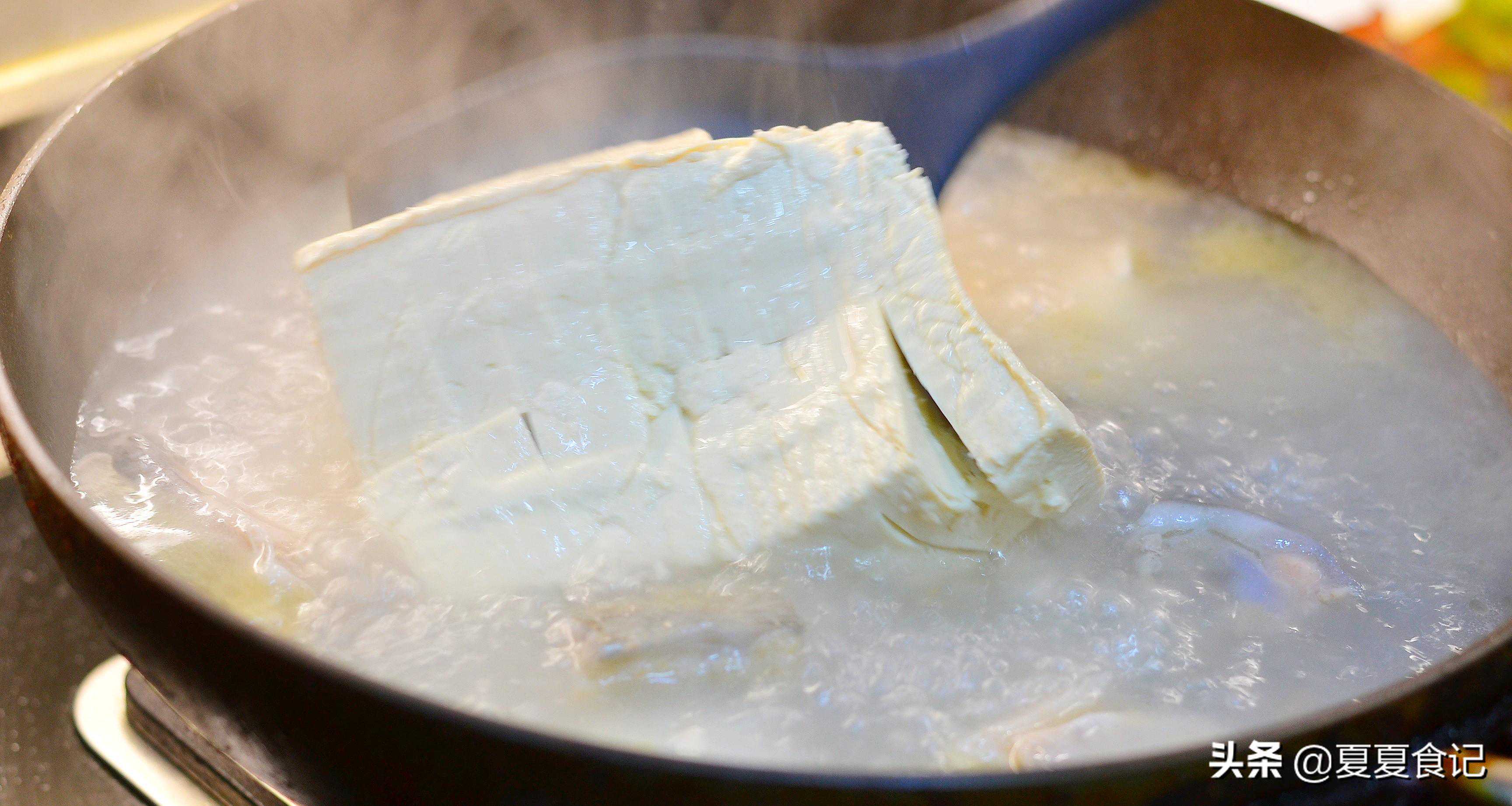 ⑥汤煮开后,我们揭开锅盖,下入豆腐,我们在煮汤时选择的是嫩豆腐,一般炒着吃才会选老豆腐,所以在切豆腐和下豆腐时都要特别注意,不要用力过猛,动作要轻柔,才能保持豆腐的完整性。我们把切好的豆腐块,轻轻的放在铲子上,然后慢慢的放入煮开的鱼汤中,放进去后不要翻动它,豆腐遇开水,蛋白会凝固收缩,这个时候豆腐就不容易散开了。然后我们再盖上锅盖用小火焖上8-10分钟左右就差不多可以出锅了,对,一定是小火,小火煮出来的汤才会鲜甜好喝啊。
