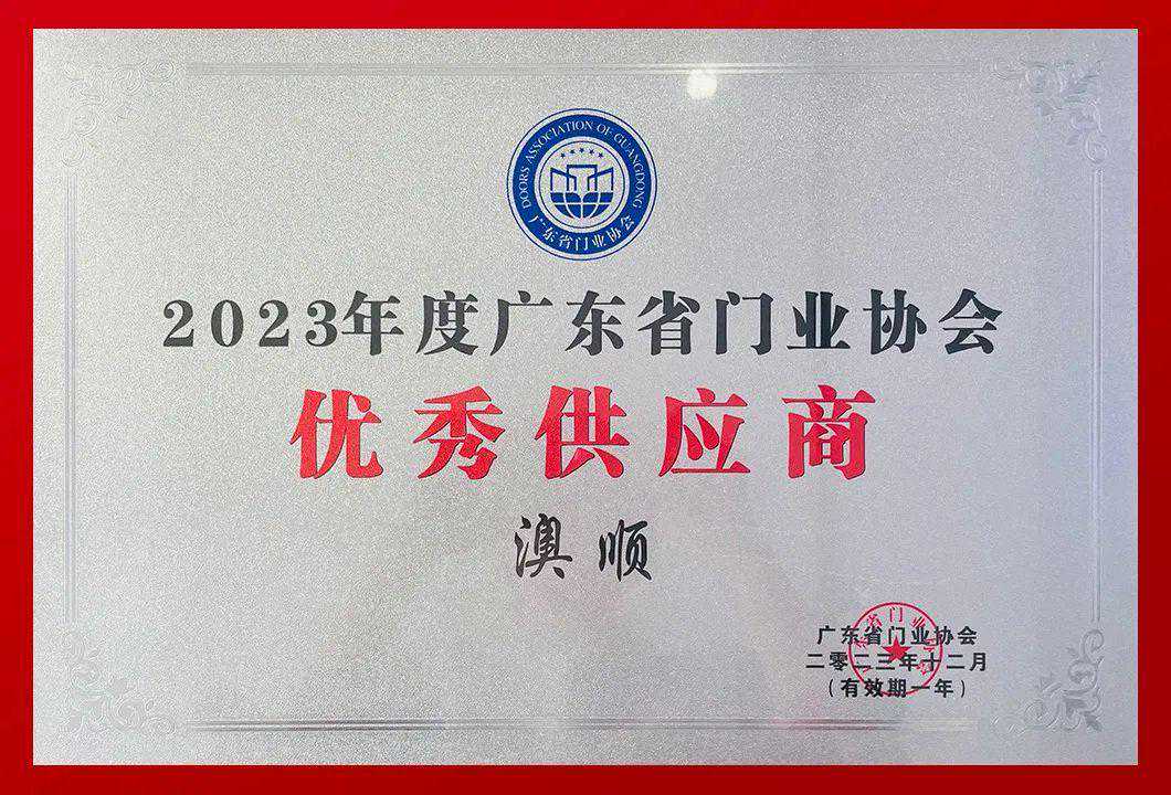 澳顺荣获2023年度广东省门业协会「优秀供应商」、「优秀企业」两大奖项。这份荣耀,是行业协会、行业伙伴对澳顺品牌力、产品力与服务力的肯定与支持,也是对澳顺持续从产品创新开发、质量管控等方面助力门业高质量发展的赞赏。澳顺将以这份荣誉为契机,坚定地迈向未来,为行业、社会创造更多价值。