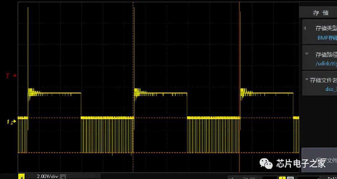 在电路的BUZZER输入20Hz的脉冲信号,让蜂鸣器鸣叫,检测蜂鸣器输入管脚处信号,发现蜂鸣器在发声时,在控制电平上叠加了1.87KHz,-2.92V的脉冲信号,并且在蜂鸣器关断时出现正向尖峰脉冲(≥10V),如图7所示。