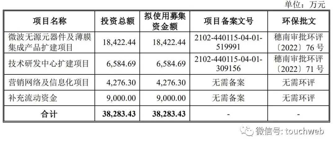 其中,1.84亿用于微波无源元器件及薄膜集成产品扩建项目,6585万元用于技术研发中心扩建项目,4276.3万用于营销网络及信息化项目,9000万元用于补充流动资金。