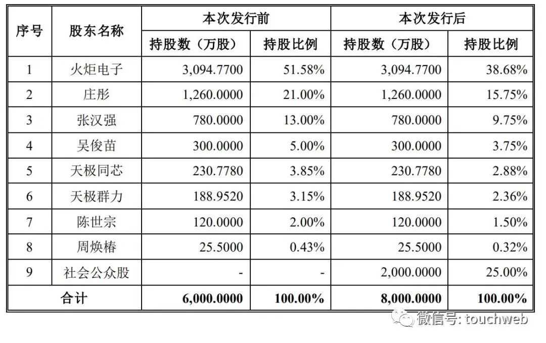 IPO后,火炬电子持股38.68%,庄彤持股15.75%,张汉强持股9.75%,吴俊苗持股3.75%;