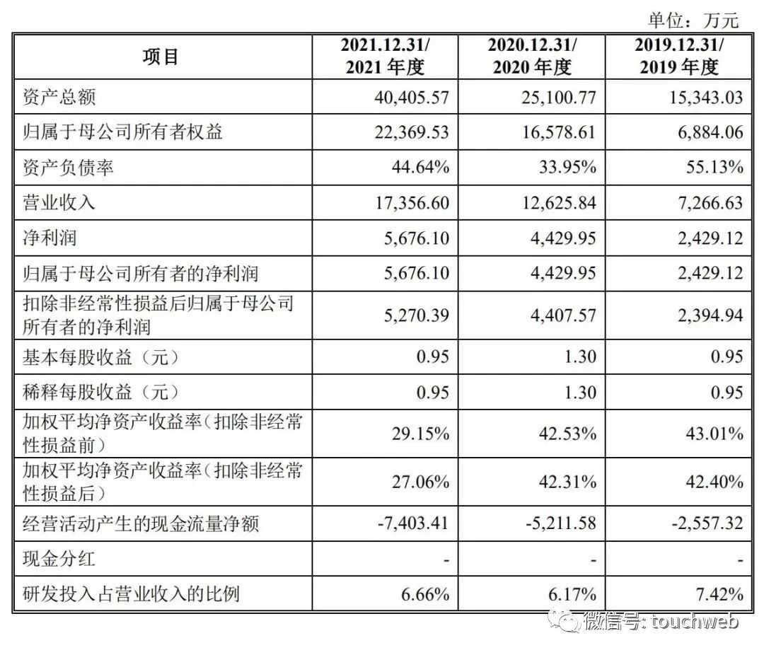 招股书显示,天极科技2019年、2020年、2021年营收分别为7266.6万元、1.27亿元、1.74亿元;净利分别为2429万元、4429.95万元、5676万元;扣非后净利分别为2394.9万元、4407.57万元、5270.39万元。