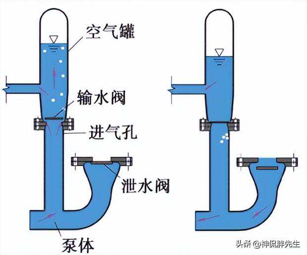 (2)由于泄水阀突然关闭,系统发生水锤作用,泵体内压力急剧增加.高压推动输水阀打开,水由泵体进入空气罐,进入空气罐内的水,一部分直接经由扬水管到达高位水池,而大部分则通过压缩空气暂时存储在空气罐内。