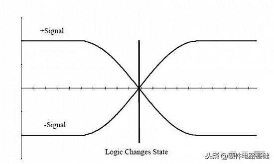 相比单端信号(以一个不太精确的受电路板其他位置的噪声的干扰的信号为参考),差分信号(彼此互为参考)的翻转时序可以更精确地设定。差分对的交叉点定义得非常精确(见图3)。单端信号位于逻辑1和逻辑0之间的交叉点受制于(举例)噪声、噪声门限以及门限检测问题等等。