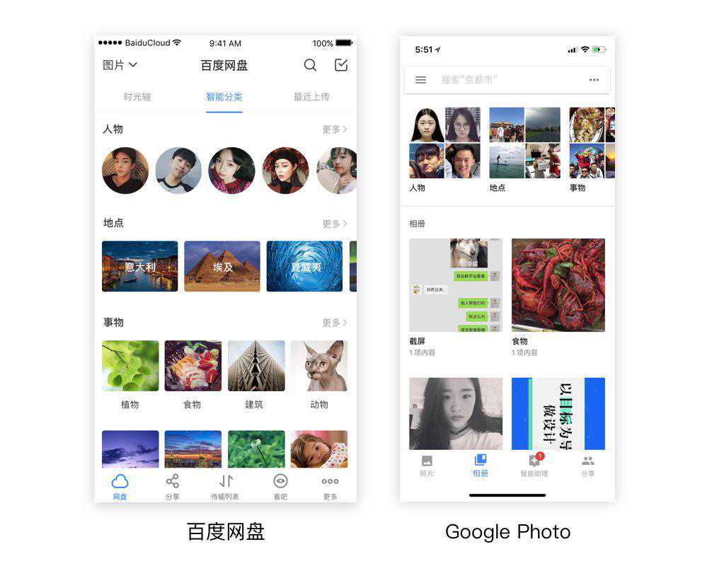 比如:百度网盘,GooglePhoto,通过对人物、事物、地点,进行不同颗粒度的区分,帮助用户快速筛选目标图片。
