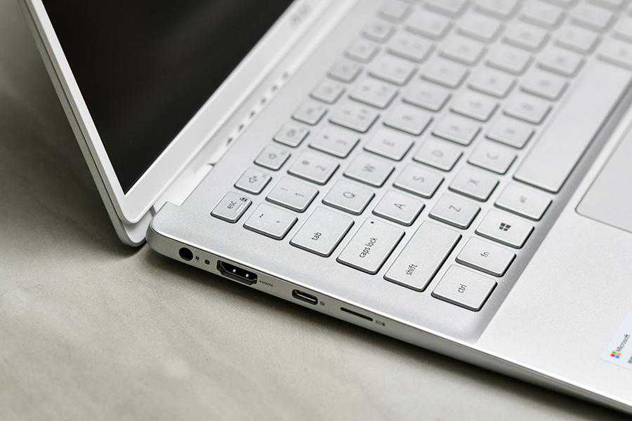 灵越5000的接口也很齐全,毕竟要作为生产力工具这都少不了:SD读卡器、全功能C口、全尺寸的HDMI口。USB虽然只有一个,但在办公室可以接拓展,在外也用不了那么多,基本需求是可以满足的。